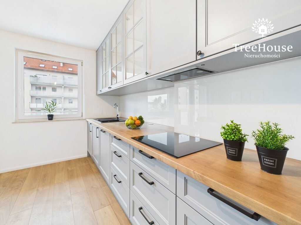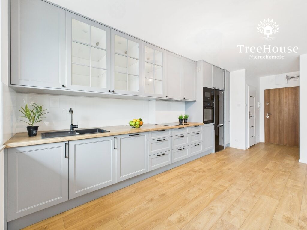 W kuchni znajduje się nowoczesna zabudowa stała z kompletnym