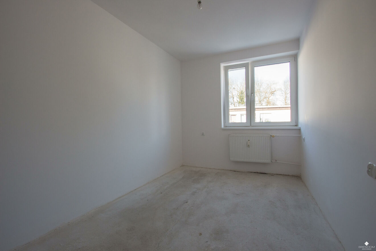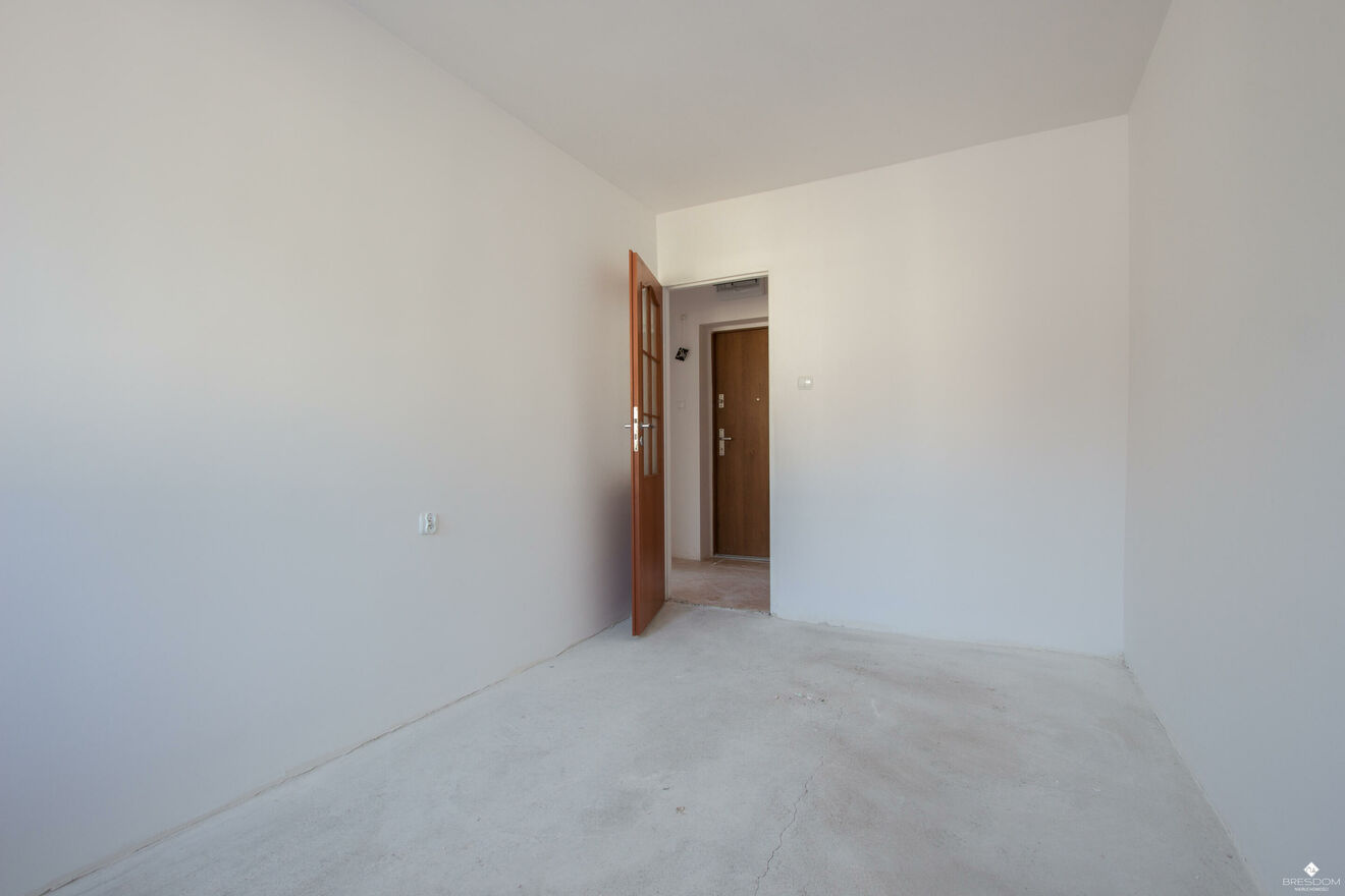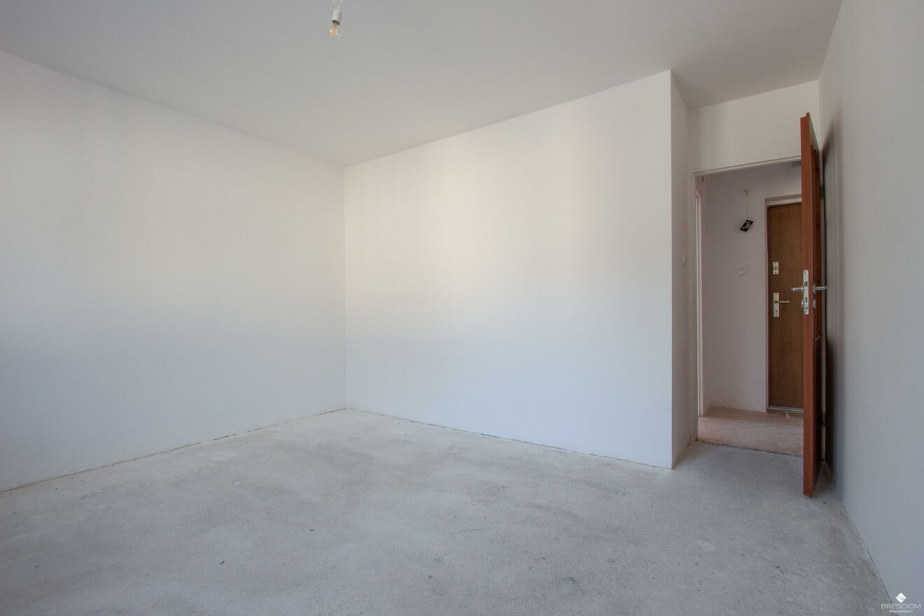 Mieszkanie zostało doprowadzone do stanu deweloperskiego, ściany są wyszpachlowane i pomalowane na biało, nowa instalacja elektryczna.